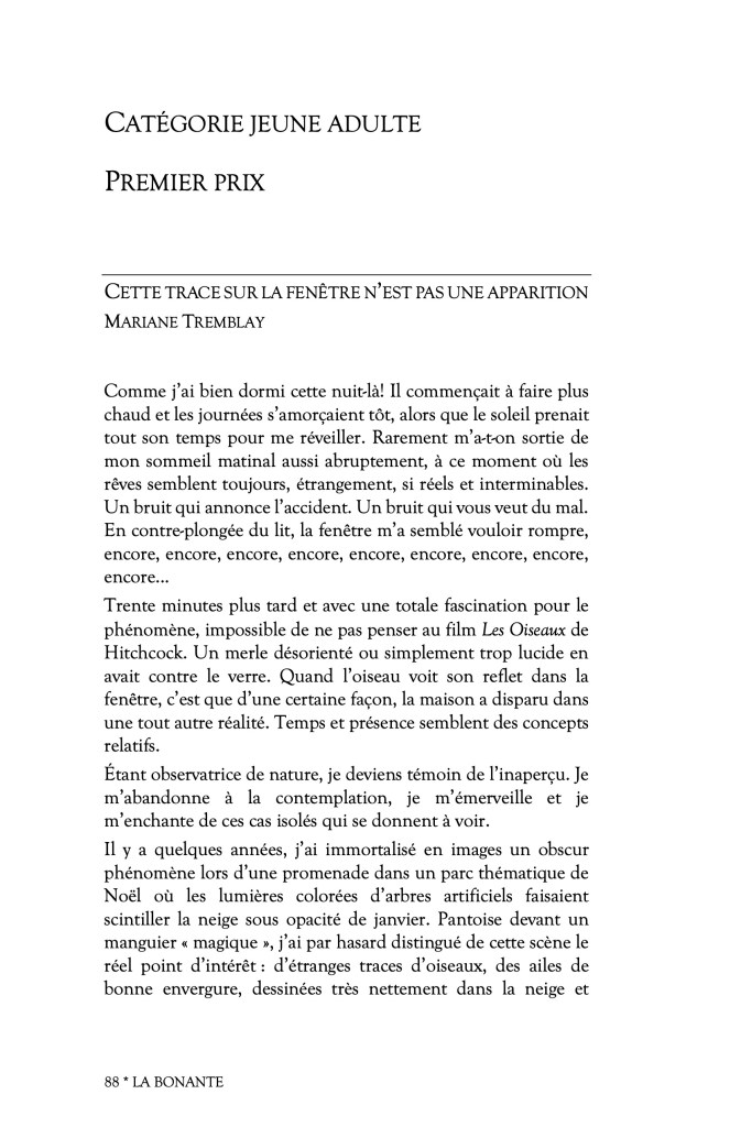 Cette trace sur la fenêtre n’est pas une apparition (2018), paru dans La Bonante 2018, Concours littéraire Damase-Potvin – 1er prix catégorie Jeune adulte, p. 88-90.