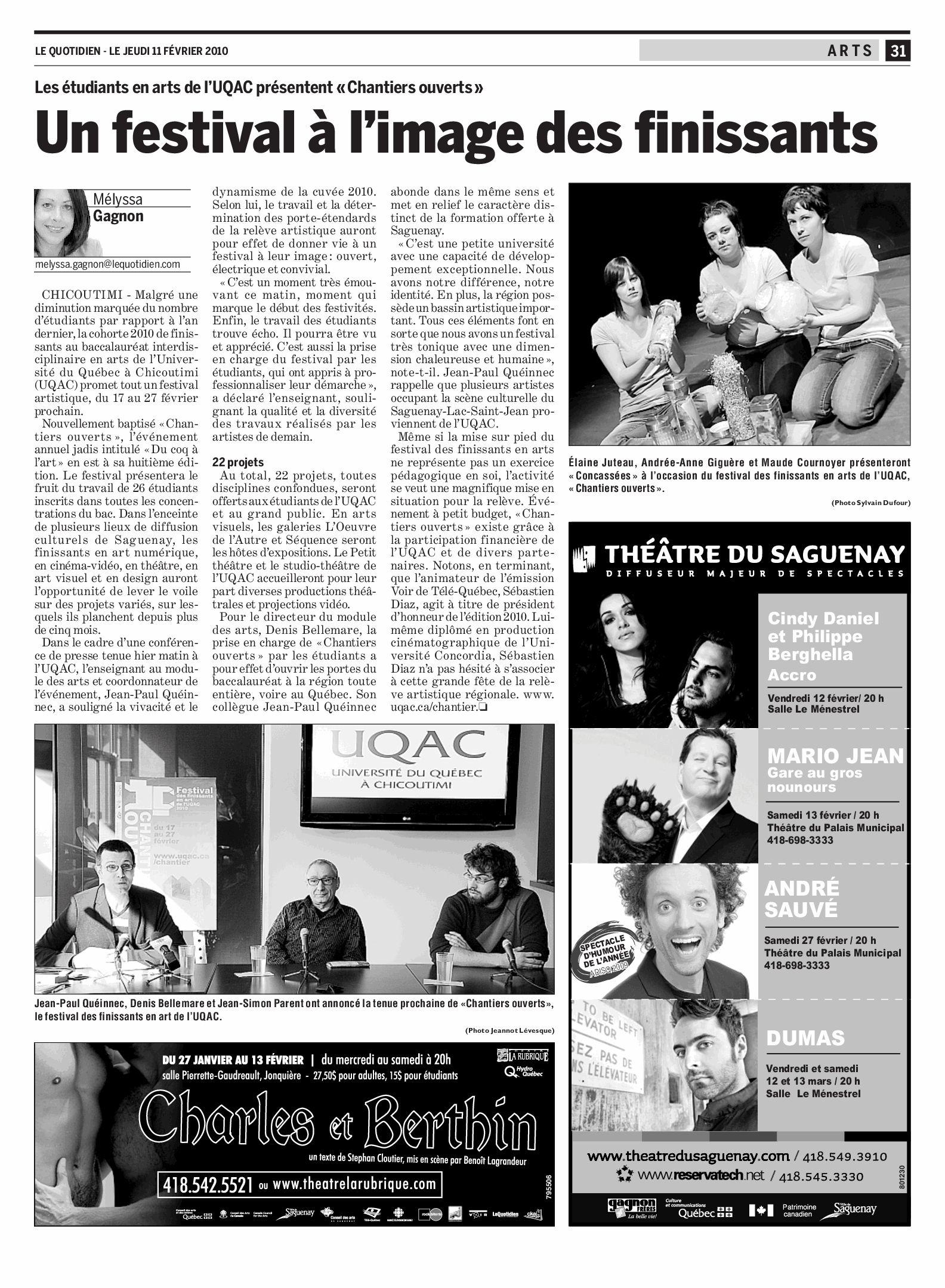 « Un festival à l’image des finissants » par Mélyssa Gagnon, Le Quotidien, 11 fév. 2010