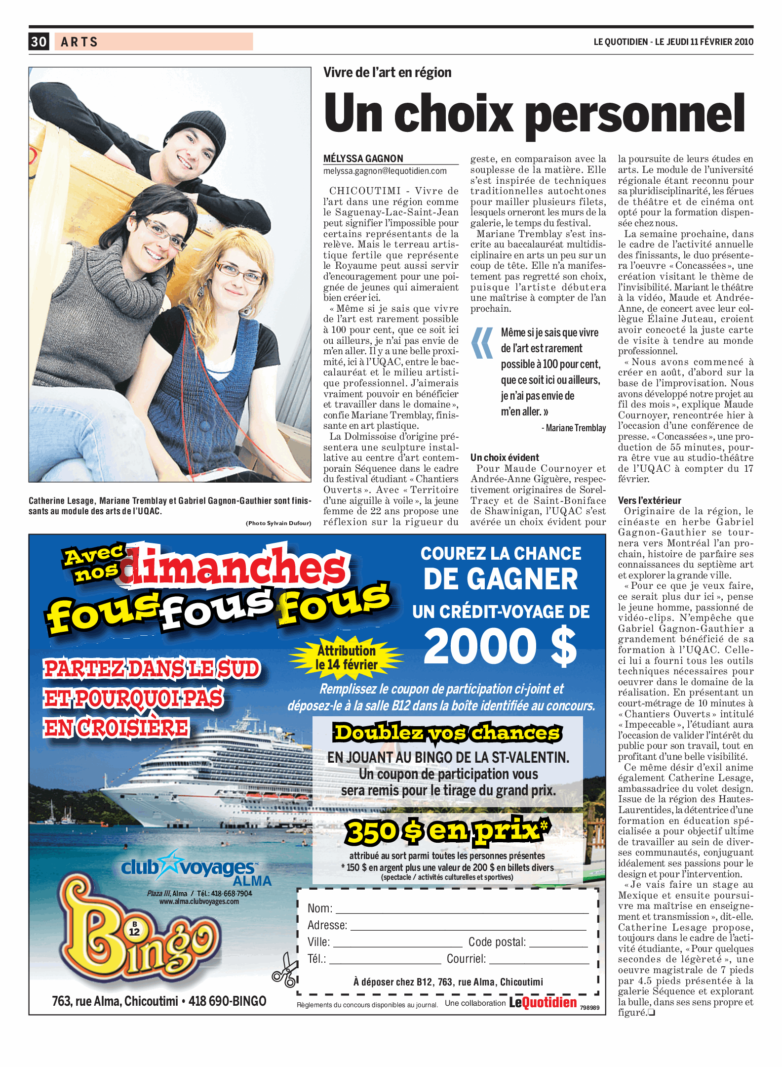 « Vivre de l’art en région » par Mélyssa Gagnon, Le Quotidien, 11 fév. 2010