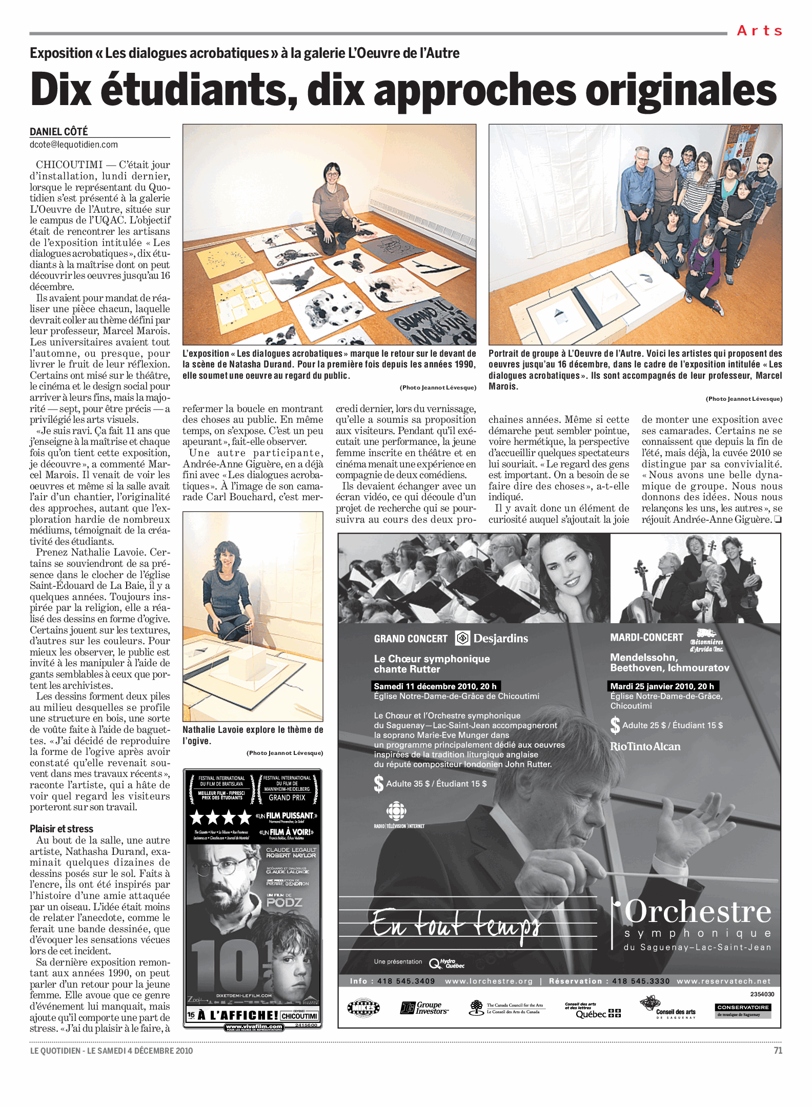 « Dix étudiants, dix approches originales » par Daniel Côté, Le Quotidien, 4 déc. 2010