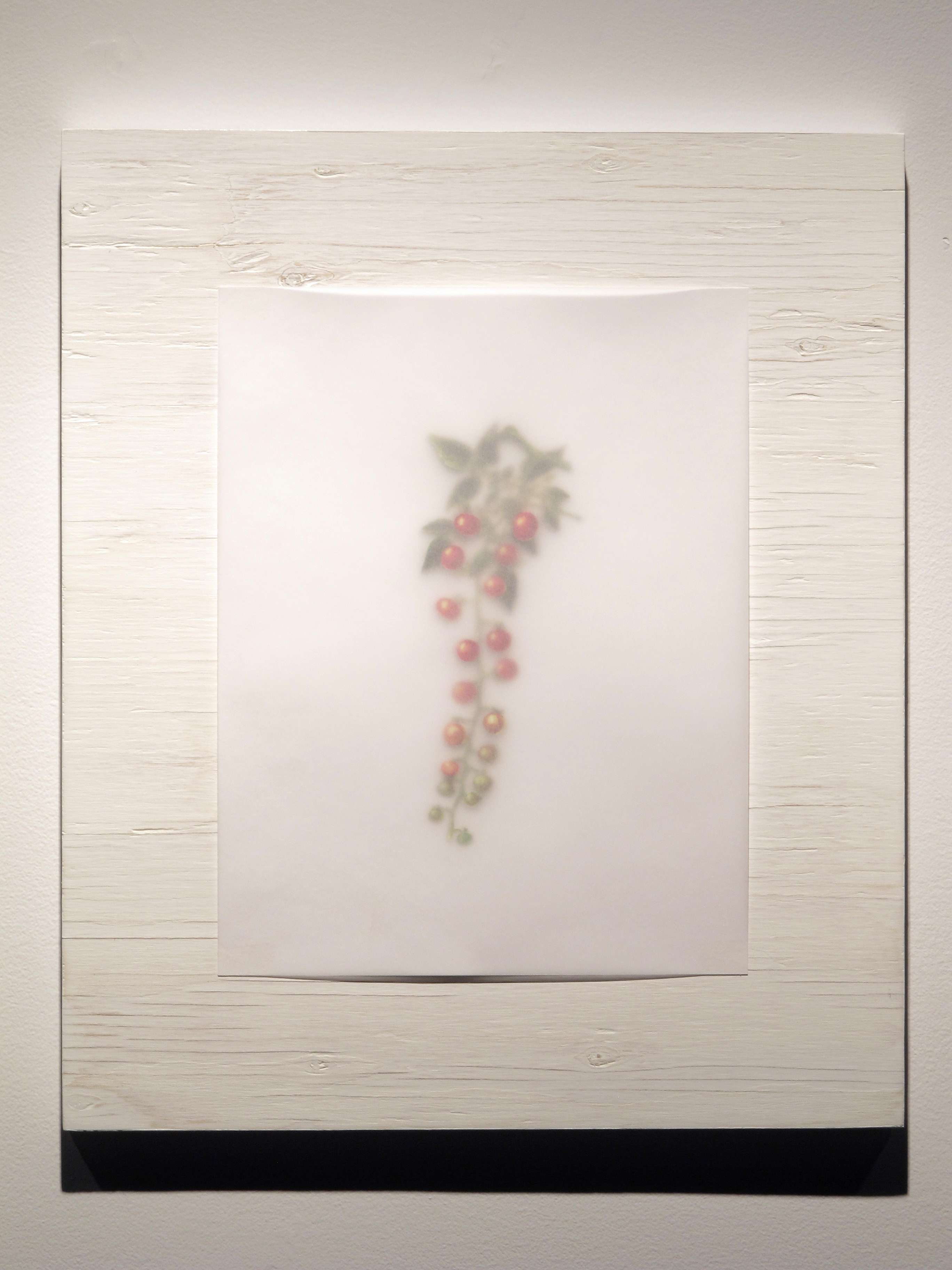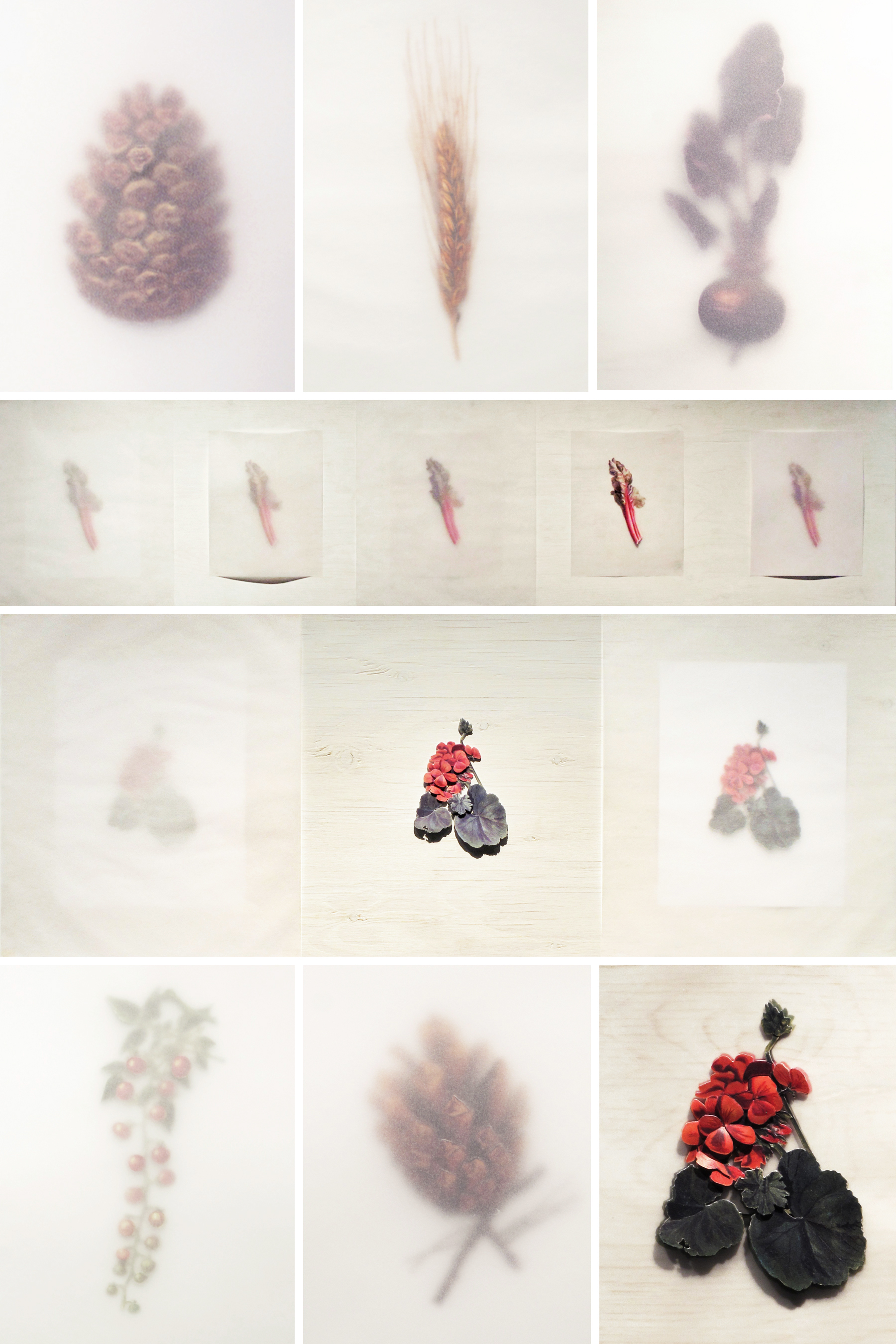 Herbier nouveau genre : série de 16 éléments sur supports de dimensions variables. Collages d’impressions numériques sur papier cartonné. Les sujets végétaux sont effacés à divers degrés par la superposition d’une ou de plusieurs couches de matières transparentes (papier vélin, calque).