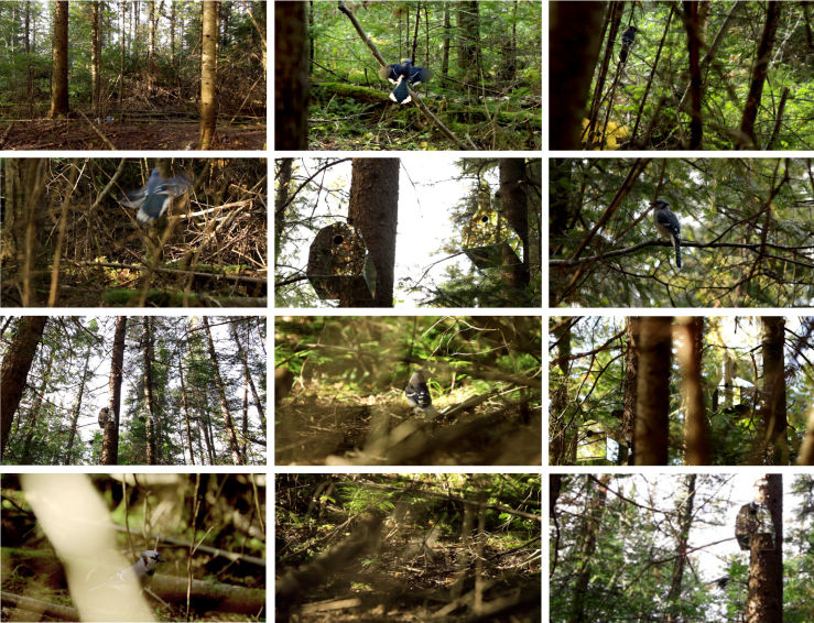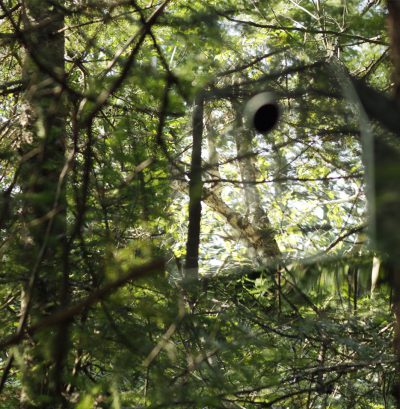 Avec la fuite graduelle des oiseaux des villes qui peut être constaté par leur chant de plus en plus rare, l’idée de disparition s’est manifestée à travers celles de camouflage et de présence qui « brille de son absence ». Des nichoirs-miroir en forme de grange, dont le trou est adapté pour le geai bleu1, et d’église, pour le merle2, se fondent et disparaissent dans la nature comme ces bâtisses qui s’effacent aujourd’hui du paysage et de notre patrimoine. Invisibles aux yeux des oiseaux qui ont l’habitude de foncer dans le reflet des fenêtres, les cabanes-miroir deviennent des abris potentiellement menaçants pour eux où il est question d’être fasciné par son reflet ou de le combattre. Tout un jeu de présence et d’absence s’est mis en branle entre l’artiste et les oiseaux pour arriver à capter un monde grouillant de vie animale qui à première vue semblait quiet. Contrairement à la croyance populaire, les chants d’oiseaux en sont de guerre, de survie et de délimitation du territoire. La vidéo est construite de manière à nous faire pénétrer dans une forêt que l’on découvre plutôt comme le territoire des oiseaux, que l’on entend avant de voir, où la notion de présence est remise en perspective.