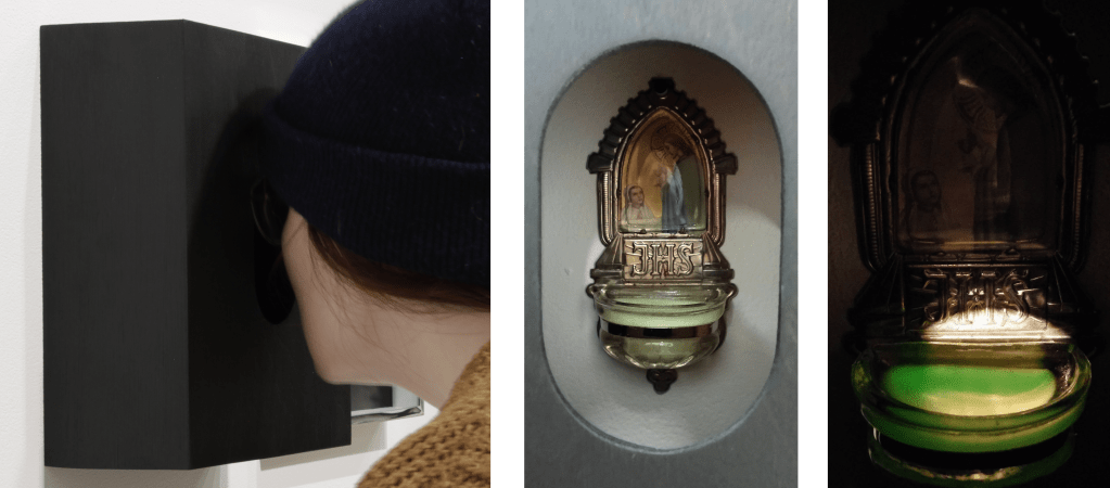 Jeune, intriguée par une de ces statues devant une maison, on m’a expliqué qu’elle avait été installée par la dame suite à une apparition mystique de Marie. Une apparition… Qualifiée d’hallucination même par les plus croyants, comment une perception aussi inexplicable peut-elle influencer une vie entière? Restée sur cette idée, j’ai entrepris de rencontrer les raisons pouvant pousser quelqu’un à « afficher ses couleurs » et à ériger un espace religieux aussi assumé et visible à la maison. Ce phénomène de culte a été le point de départ d’une série de rencontres avec des gens qui en ont construit, installé ou hérité, qui s’est révélée être une riche cueillette de matière première composée de témoignages, de photographies et de coïncidences.