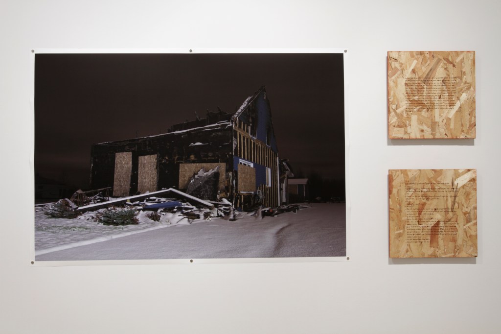 « Fait étrange, c’est en étant hypnotisée par un incendie un soir au centre-ville d’Alma que le projet Les Veilleuses s’est mis en branle. Par la suite, dans une approche d’ouverture j’ai moi aussi été témoin; toutes sortes de situations liées au feu se sont présentées à moi au cours de ma dizaine de rencontres, dont cette autre maison calcinée vue sur le chemin menant chez quelqu’un qui allait me confier son parcours de vie plutôt teinté de flammes.